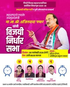 पिंपरी, पुणे (दि. ०७ जानेवारी २०२६) पिंपरी चिंचवड महानगरपालिकेच्या सार्वत्रिक निवडणुकीचा प्रचार शिगेला पोहोचला आहे. प्रभाग क्रमांक १९ मधील राष्ट्रवादी काँग्रेसच्या उमेदवारांच्या प्रचारासाठी गुरुवारी रात्री ८ वाजता, लिंक रोड, पिंपरी येथे राष्ट्रवादी काँग्रेस पार्टीचे अध्यक्ष तथा उपमुख्यमंत्री अजित दादा पवार यांच्या जाहीर सभेचे आयोजन करण्यात आले आहे अशी माहिती माजी नगरसेवक धनराज आसवानी यांनी प्रसिद्धीस दिली आहे.